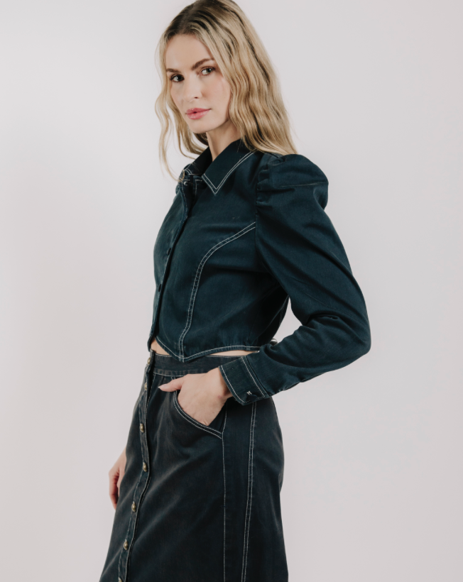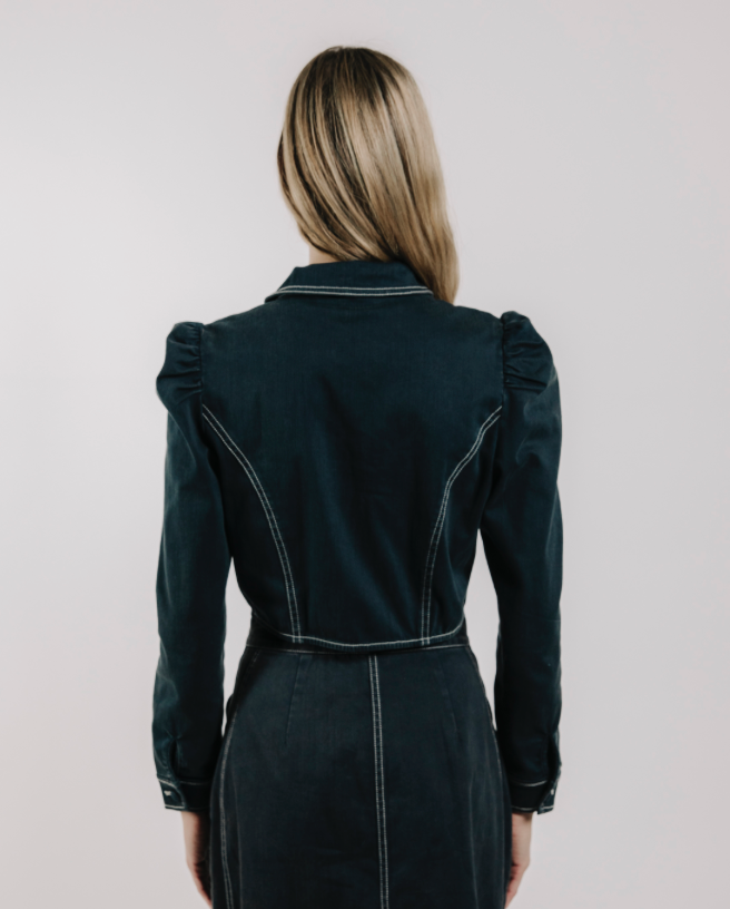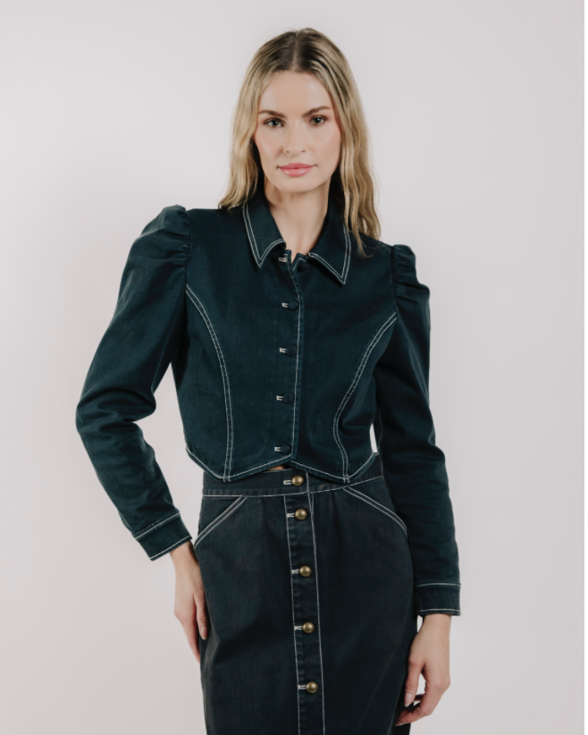 The Aurore jacket is a dark-wash, structured denim piece that pairs perfectly with the Apolline denim midi skirt for a fun and coordinated look.