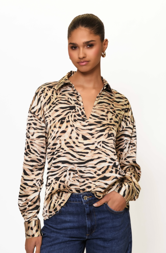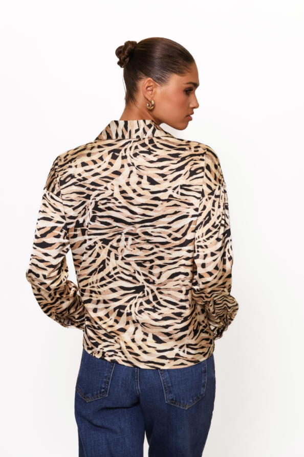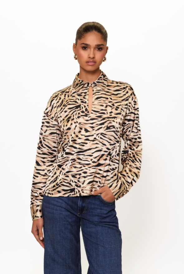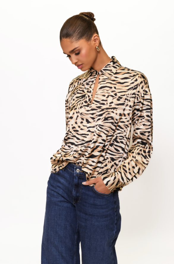 Embrace the playful spirit of fall with the Ayer Top, featuring a charming tie keyhole detail and long sleeves for cozy comfort. Its lively animal print adds a wild touch to your seasonal wardrobe, perfect for days when you want to stand out with effortless style.