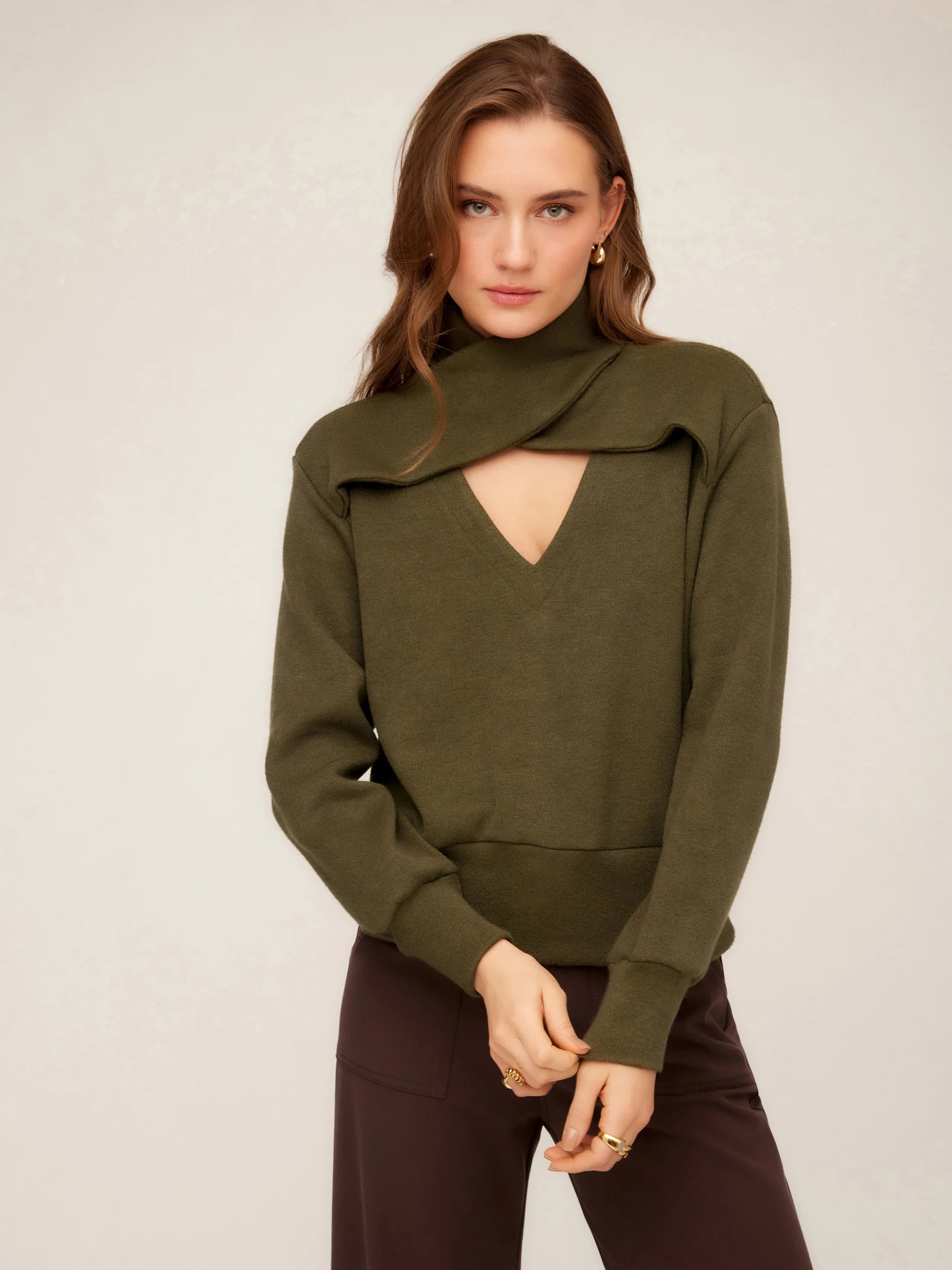 Crafted from ultra-soft Double Brushed Knit, this top features a built-in scarf detail that wraps into a sleek turtleneck. Slightly dropped shoulders and long sleeves frame a deep V-neckline for a modern contrast, while wide-edge finishes at the hem and cuffs lend a clean, structured feel. Effortlessly polished and endlessly comfortable.