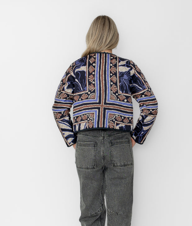 From the West of Fall Collection, this jacket flips between a smooth, unprinted black quilted side and a fun, vibrant scarf print front for twice the playful style.