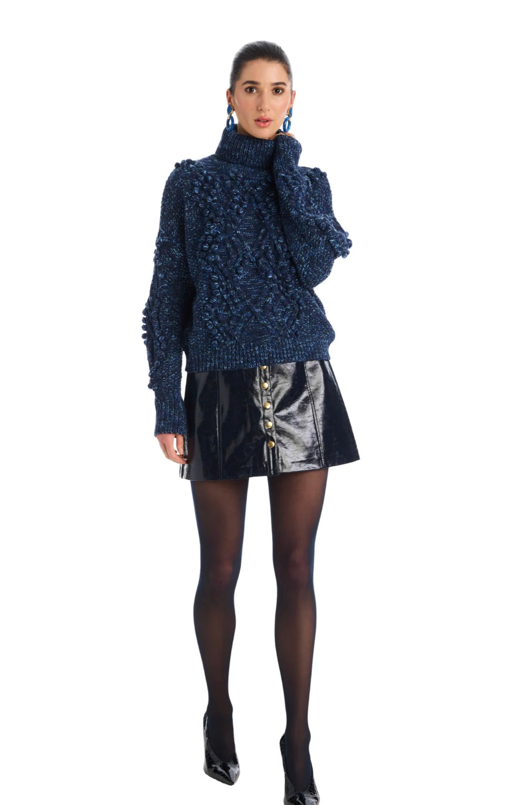 The DAPHNE SWEATER in navy space-dye features playful hand-stitched pom poms and a slouchy, relaxed fit for a cozy look. A best seller every Fall!