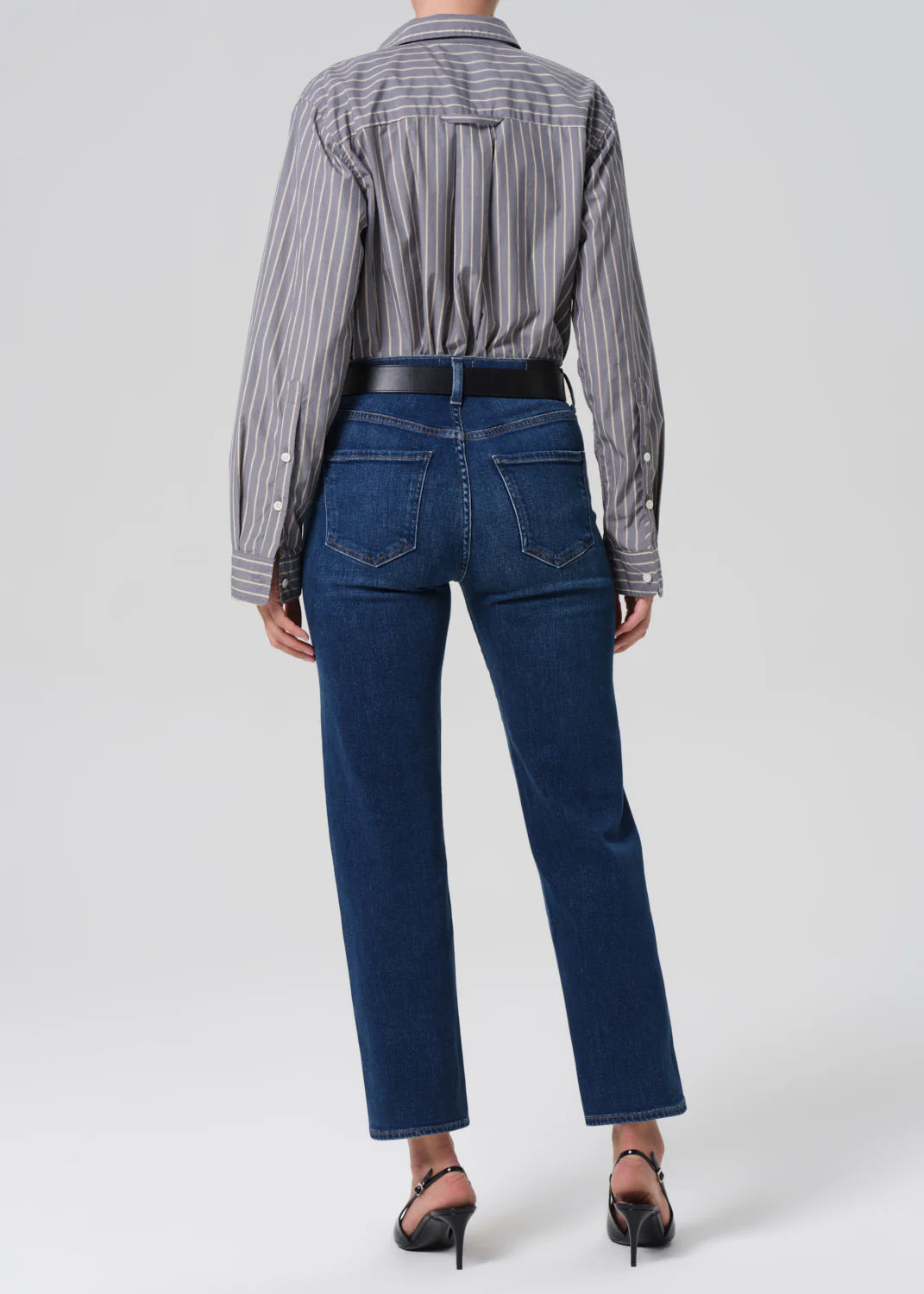 A high-rise straight leg crafted from signature cashmere-blend denim for a super-soft hand. The silhouette sits high on the waist and falls to a full-length straight leg. Finished in dark indigo with subtle fading and whiskering, it’s a refined everyday denim with effortless versatility.