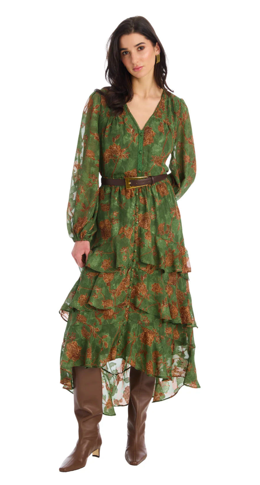Our Best Selling Ella Skirt is back in a Floral Jacquard fabrication. Designed with cascading ruffles and working buttons down the center front. An elastic waist makes for an easy pull-on style. Fully lined. Pairs perfectly back to the matching Marigold Blouse.