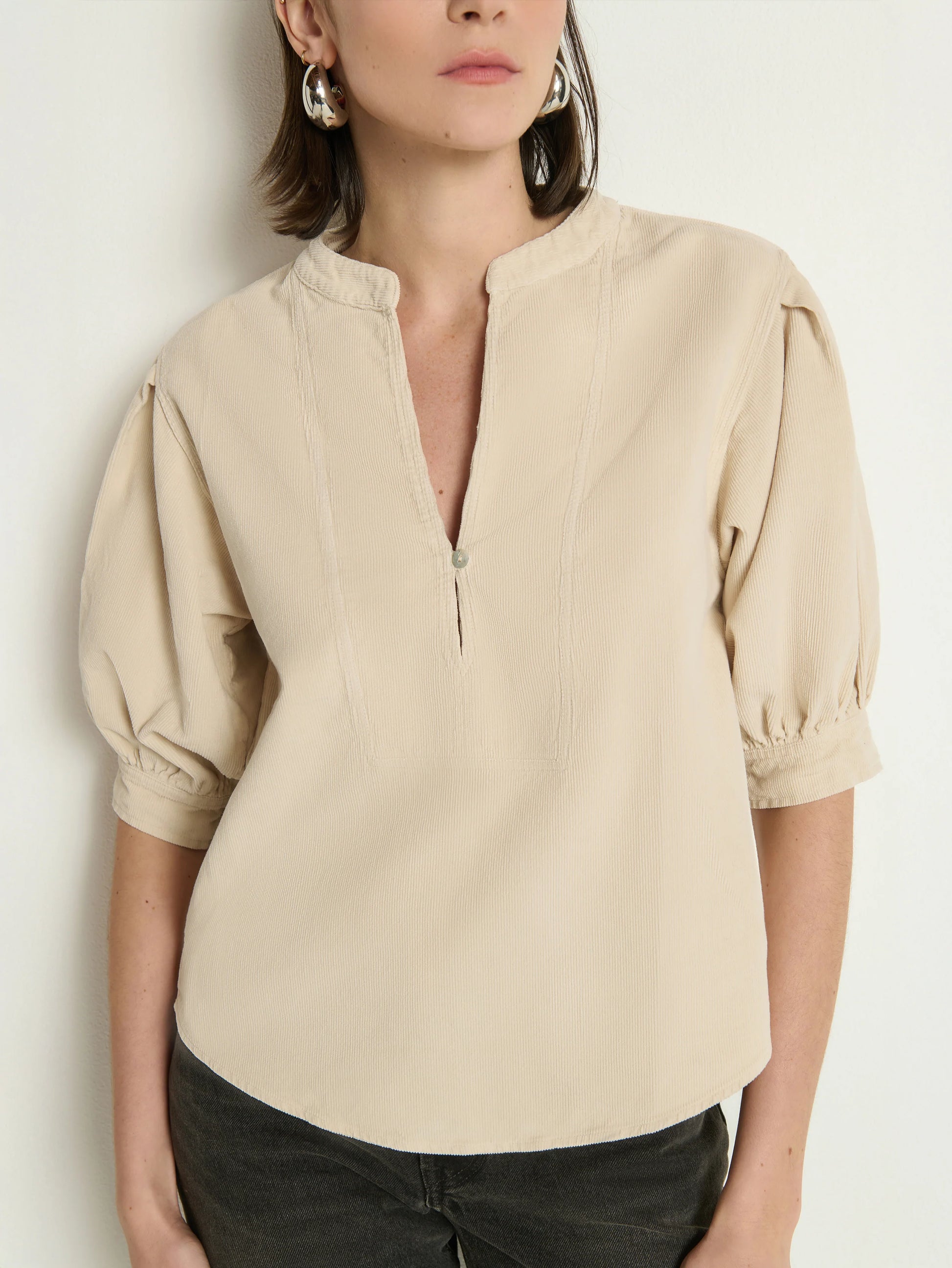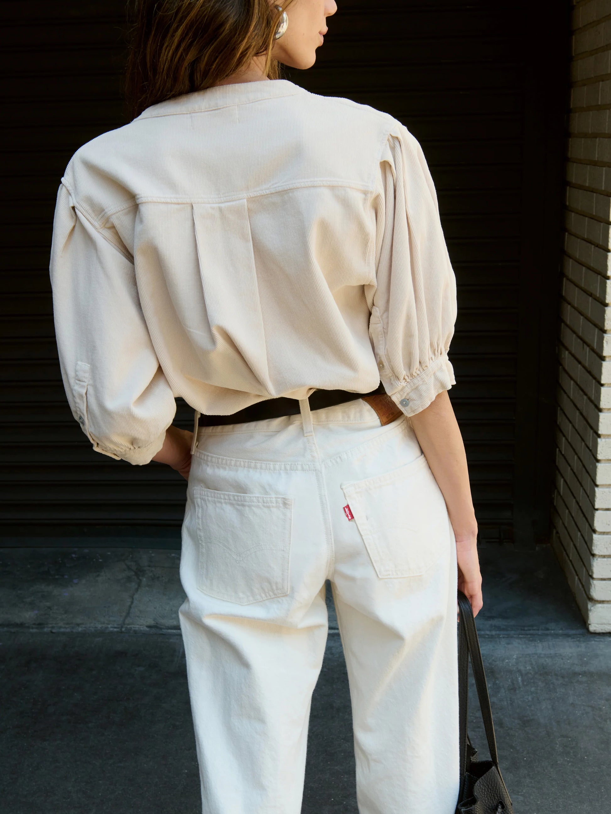 Not your average neutral. This collared corduroy top buttons at the chest and includes structured, elbow-length puff sleeves—a year-round staple, if you ask us. This one comes in Moonbeam.