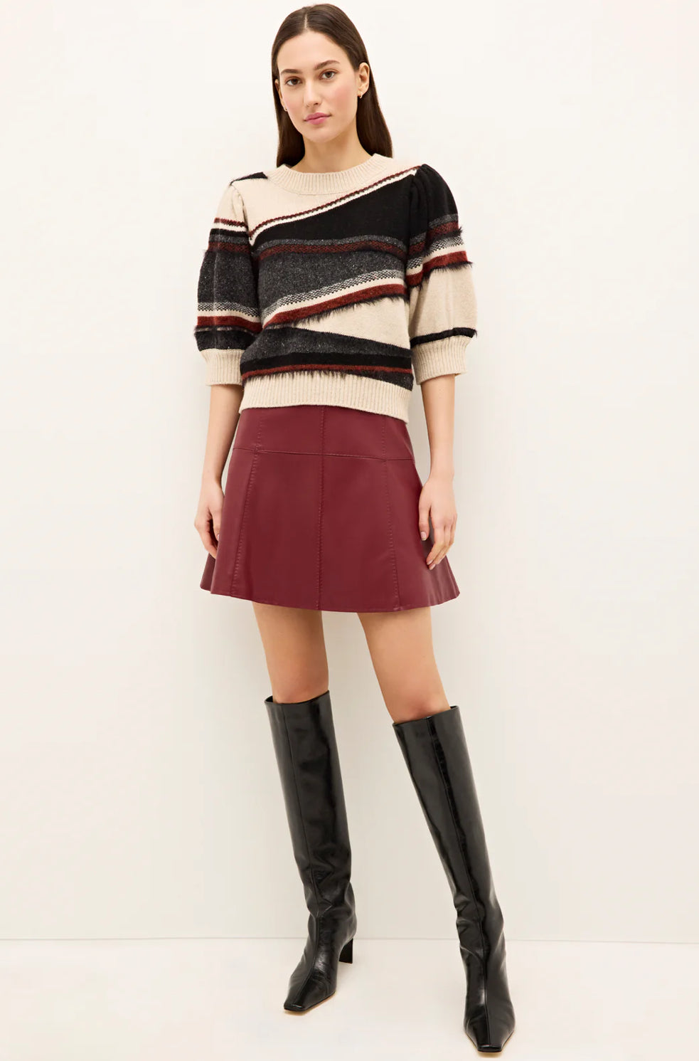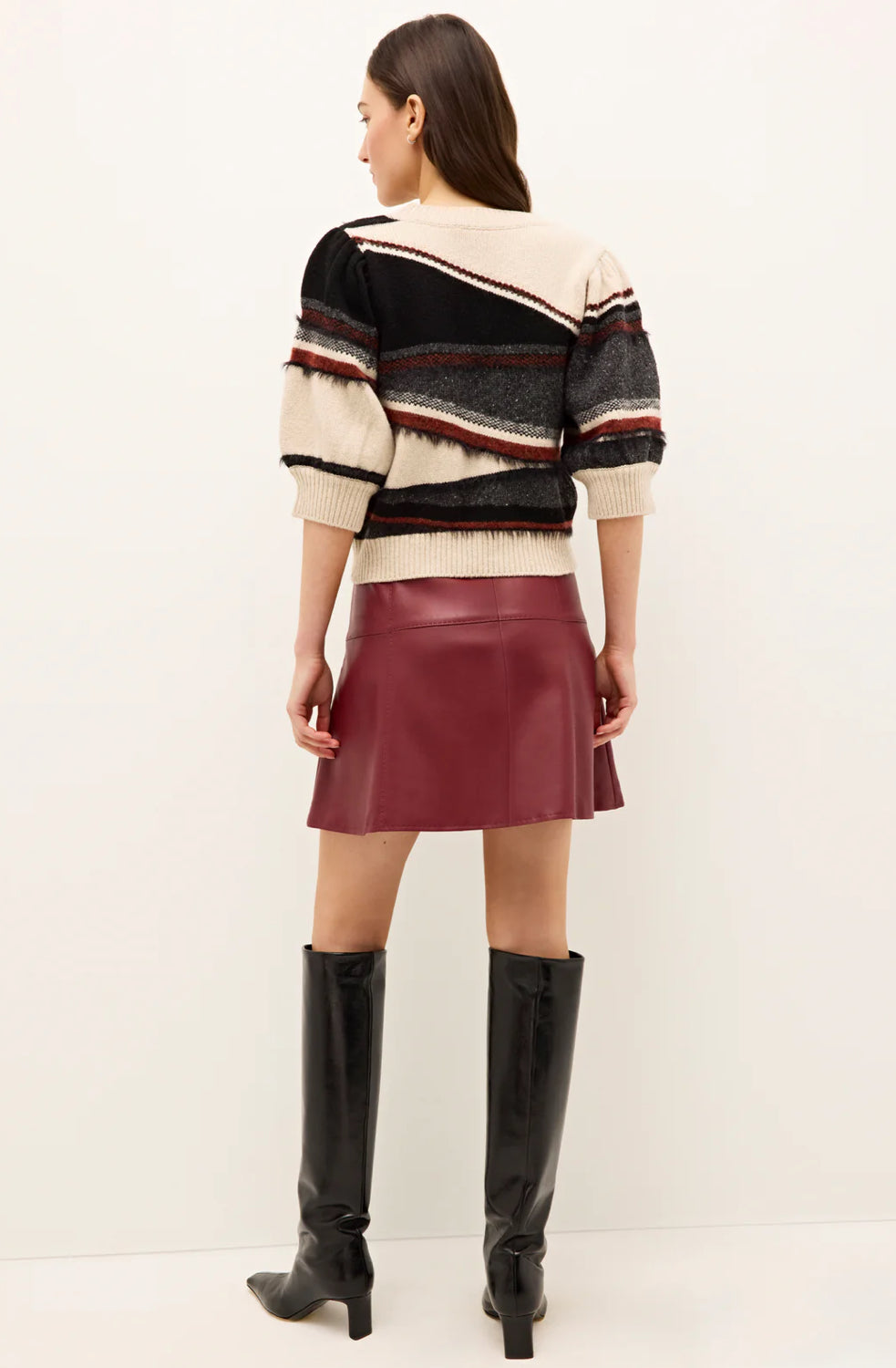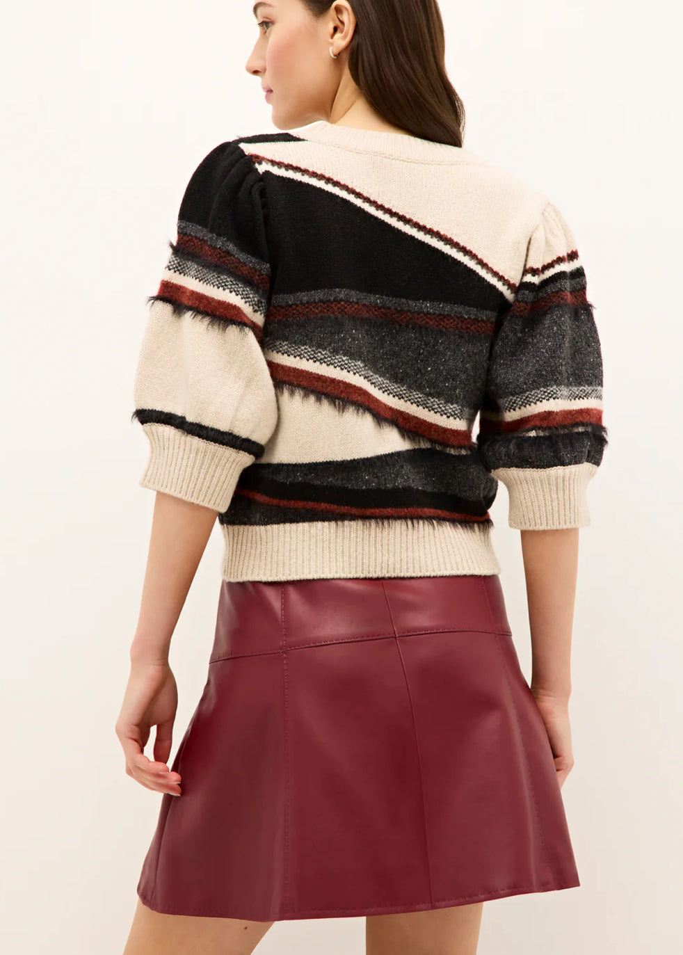Short-sleeve sweaters are the ultimate style hack for those days when the calendar reads fall but the weather tells a different (warmer) story. This season, we’ll be wearing this textured crewneck number with frayed fringe detailing and geometric slashes of autumnal color on repeat.