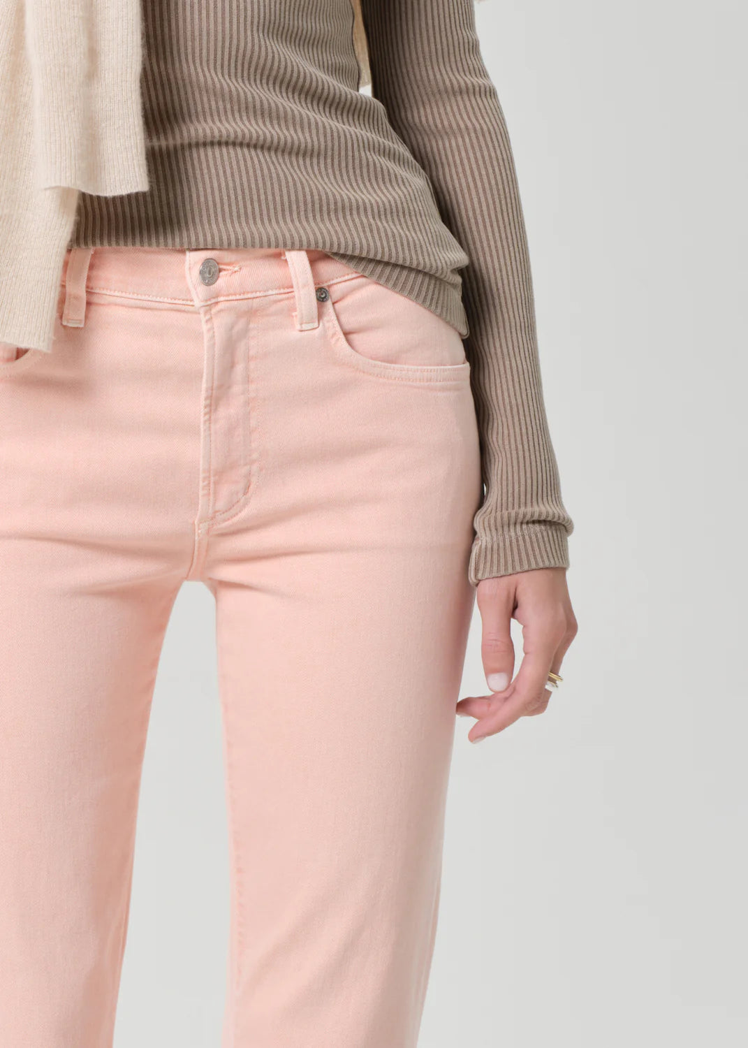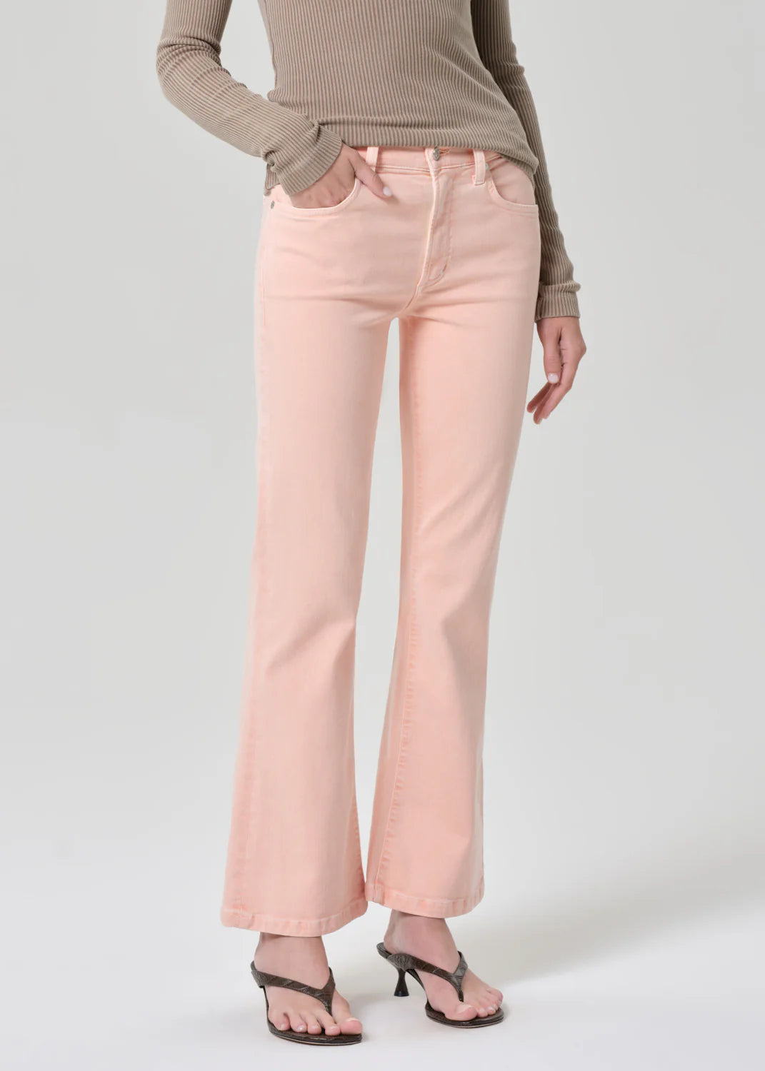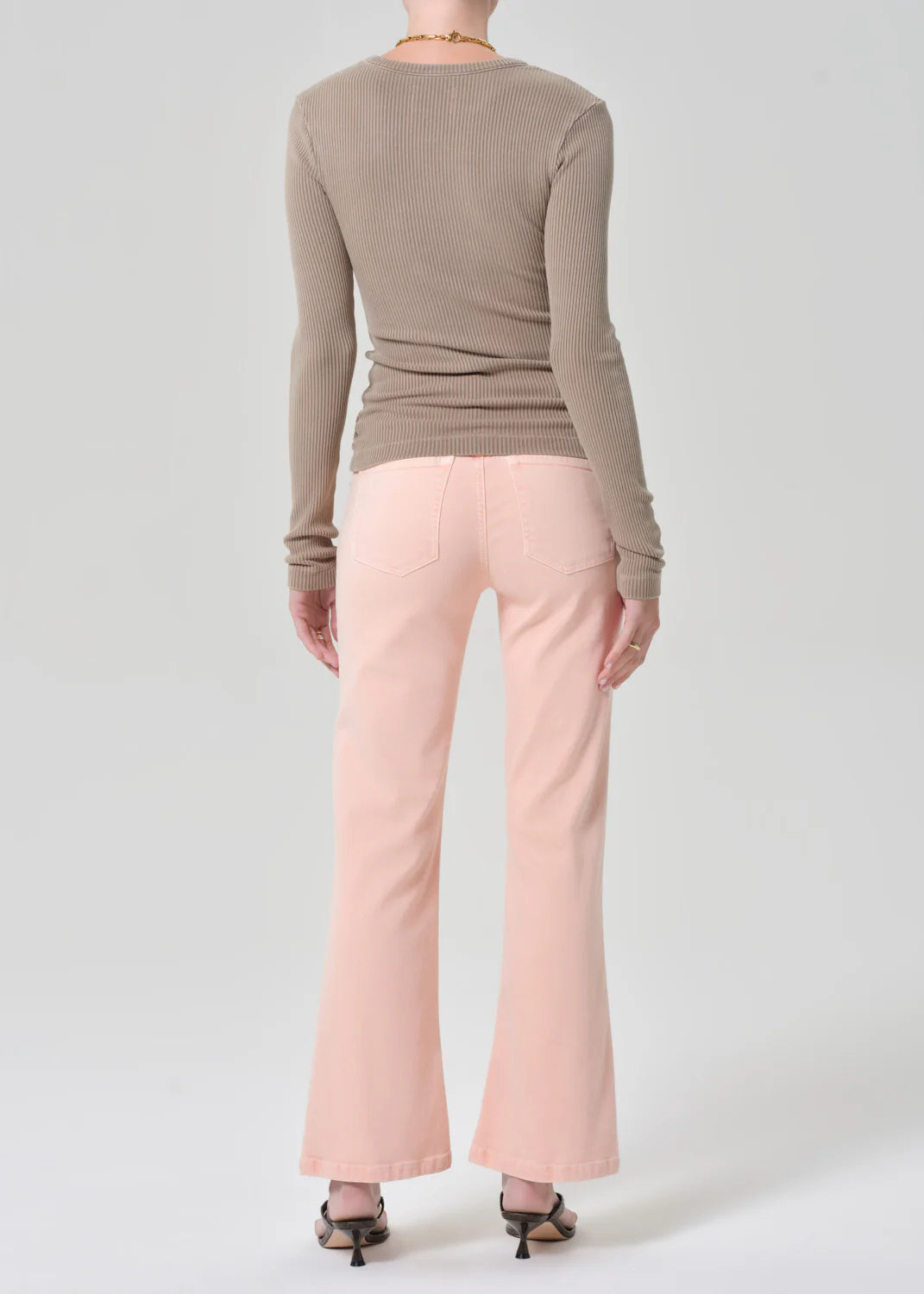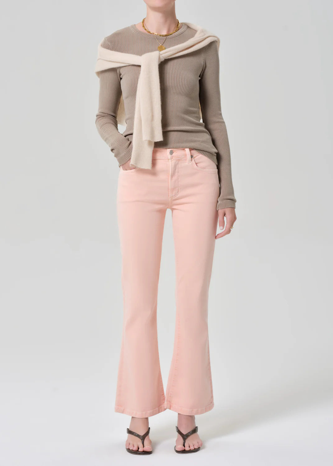 The Goldie offers a refined interpretation of ’70s-inspired denim. Designed with a mid rise and subtle kick-flare hem, the silhouette creates a long, balanced line that feels both timeless and modern. Crafted from our Signature soft stretch denim in the Melon Creme wash—a light orangey pink—it’s designed to hold its shape while maintaining a smooth, comfortable feel. The perfect balance of ease and sophistication for elevated everyday dressing.