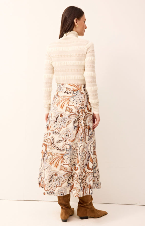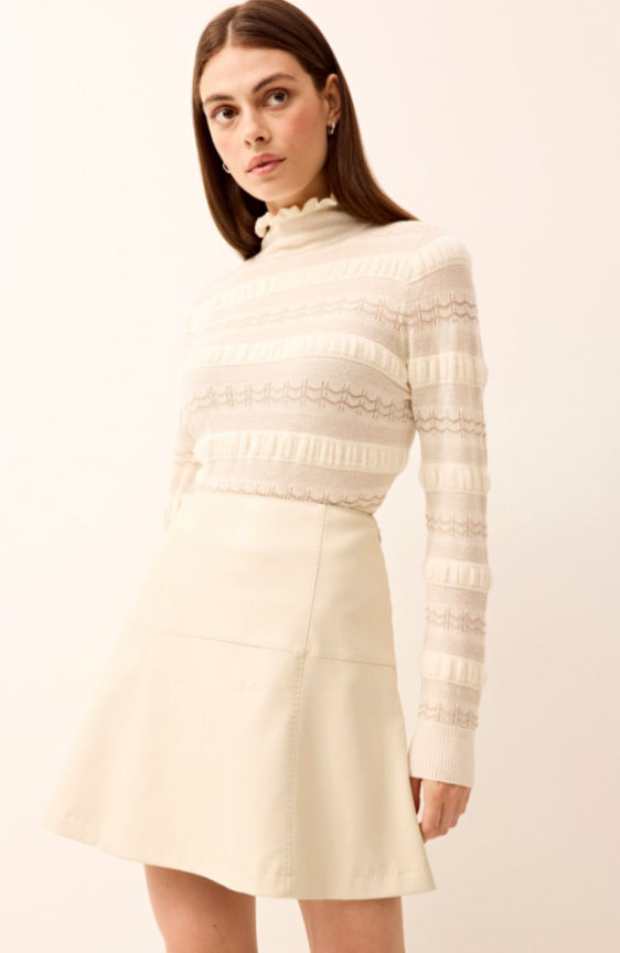 The utilitarian figure-skimming turtleneck gets a feminine upgrade with allover folded ruffle details, plus a delicate pointelle knit woven with metallic yarn for a subtle shimmer. Adison is pictured here in Ivory and is styled back to our Crawford skirt in matching vegan leather for a chic head-to-toe white look.