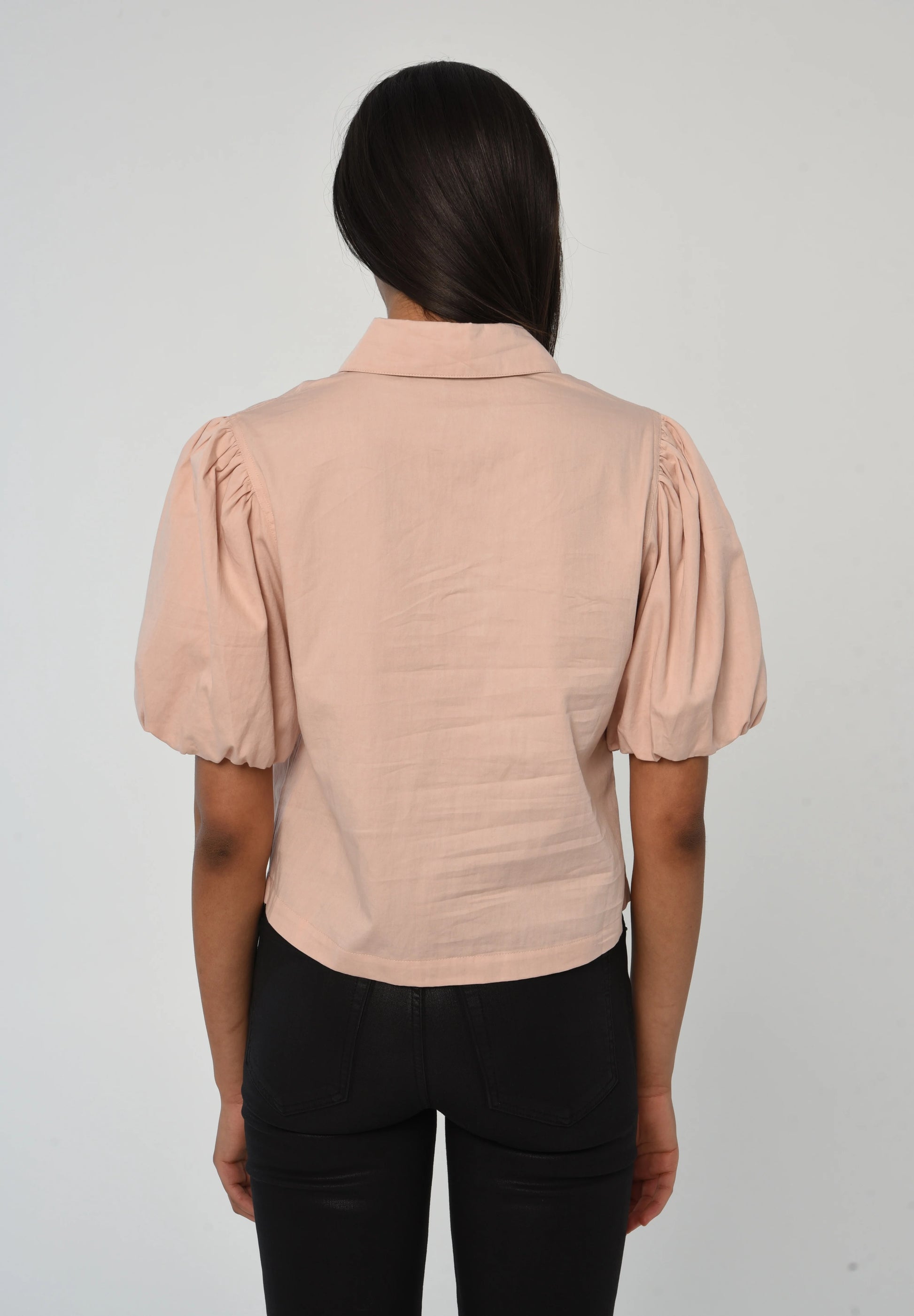 The Jamie Top in Peach Whip is a modern take on the classic button-up, featuring soft ruching at the front and subtle puff sleeves for a flattering, feminine silhouette.