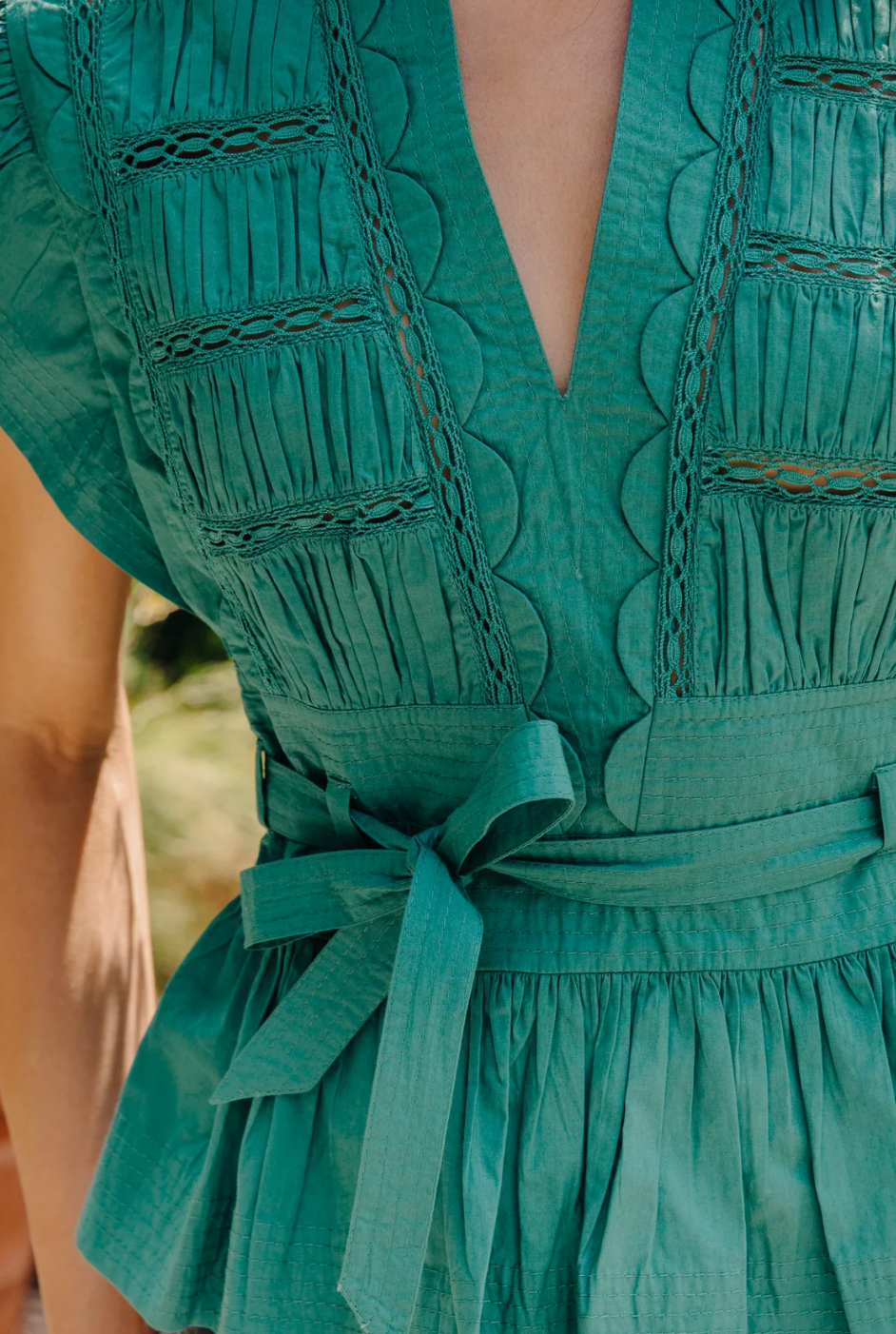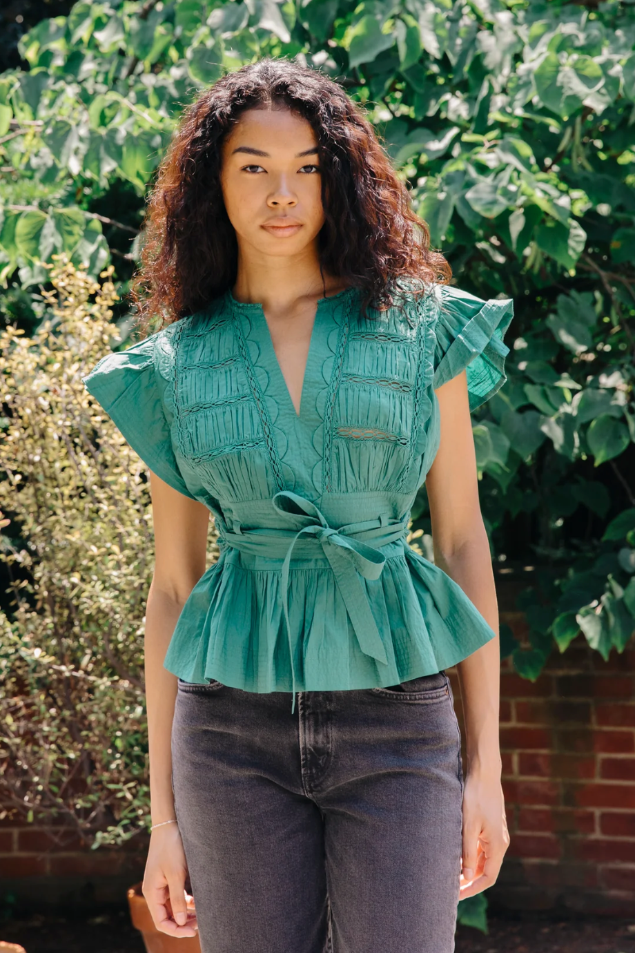The Madelyn Top in Foliage Green is filled with intricate details of gathers, pintucks, and lace trim. Finished with flutter sleeves and a peplum hem for a cinched yet feminine silhouette.