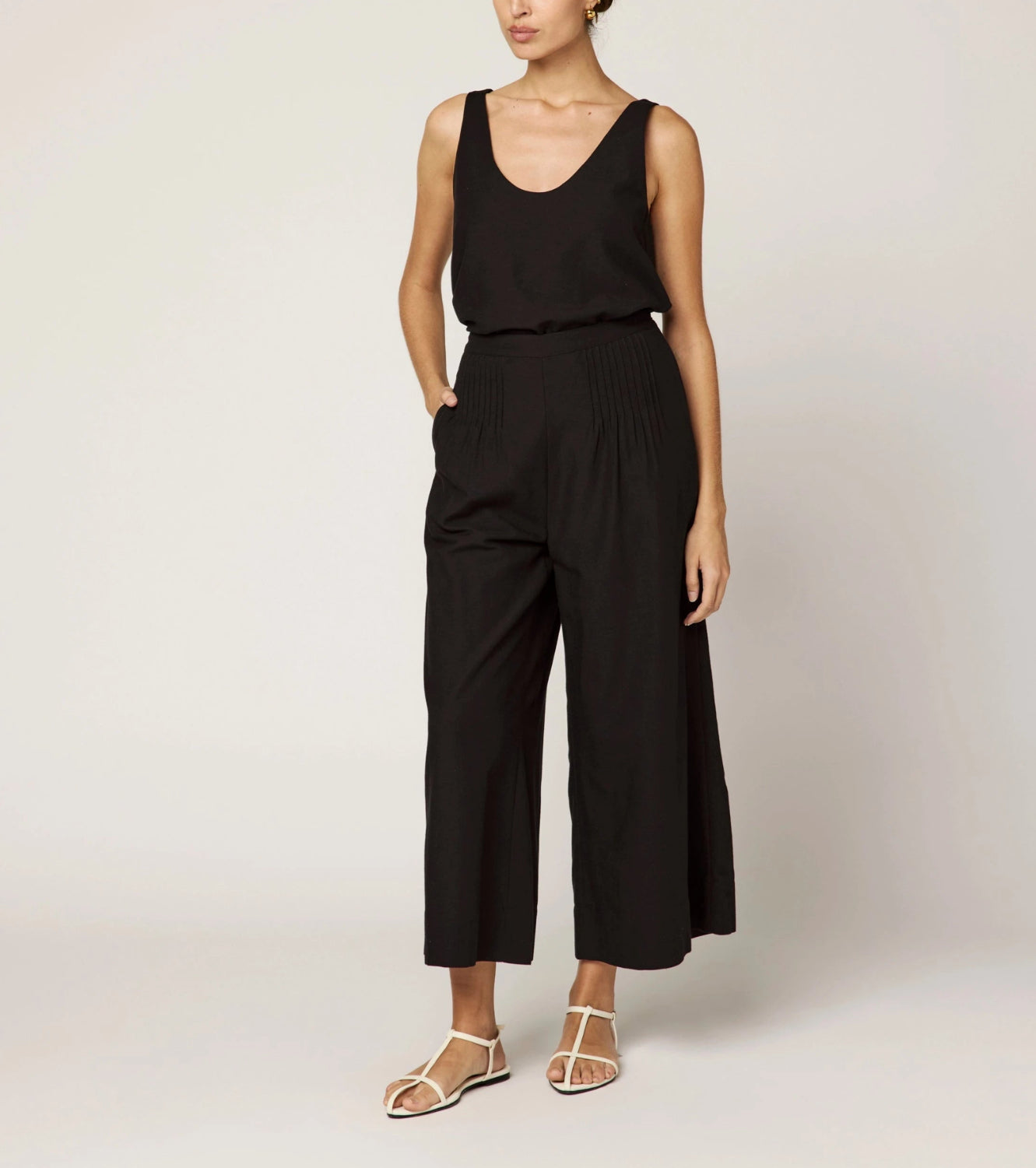 Crafted in a natural cotton-linen blend, the Manui Pant is a wide-leg trouser featuring pleated detailing at the front and an elastic waistband at the back for added comfort. Designed with a relaxed fit and side seam zipper for easy wear, it pairs effortlessly with the Ambesia Tank or the matching Kalora Blouse for a coordinated look.
