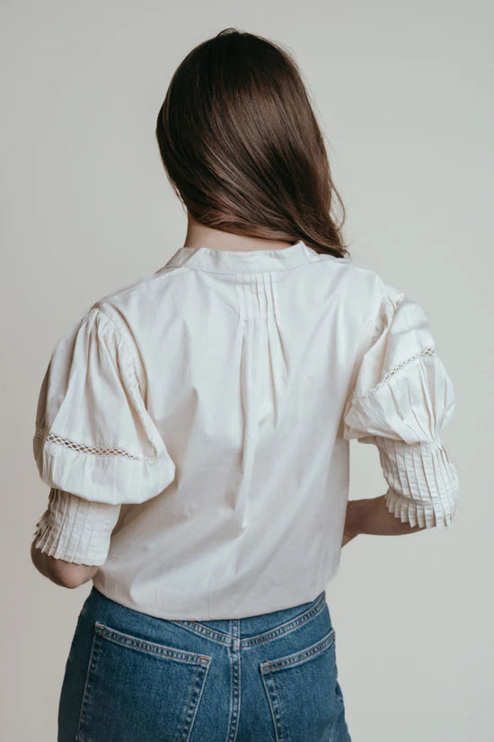 The Maria Top is a playful, bone-colored blouse with short sleeves and charming cinched arms that add a flirty touch. Light and breezy, it’s perfect for effortless style with a hint of fun.