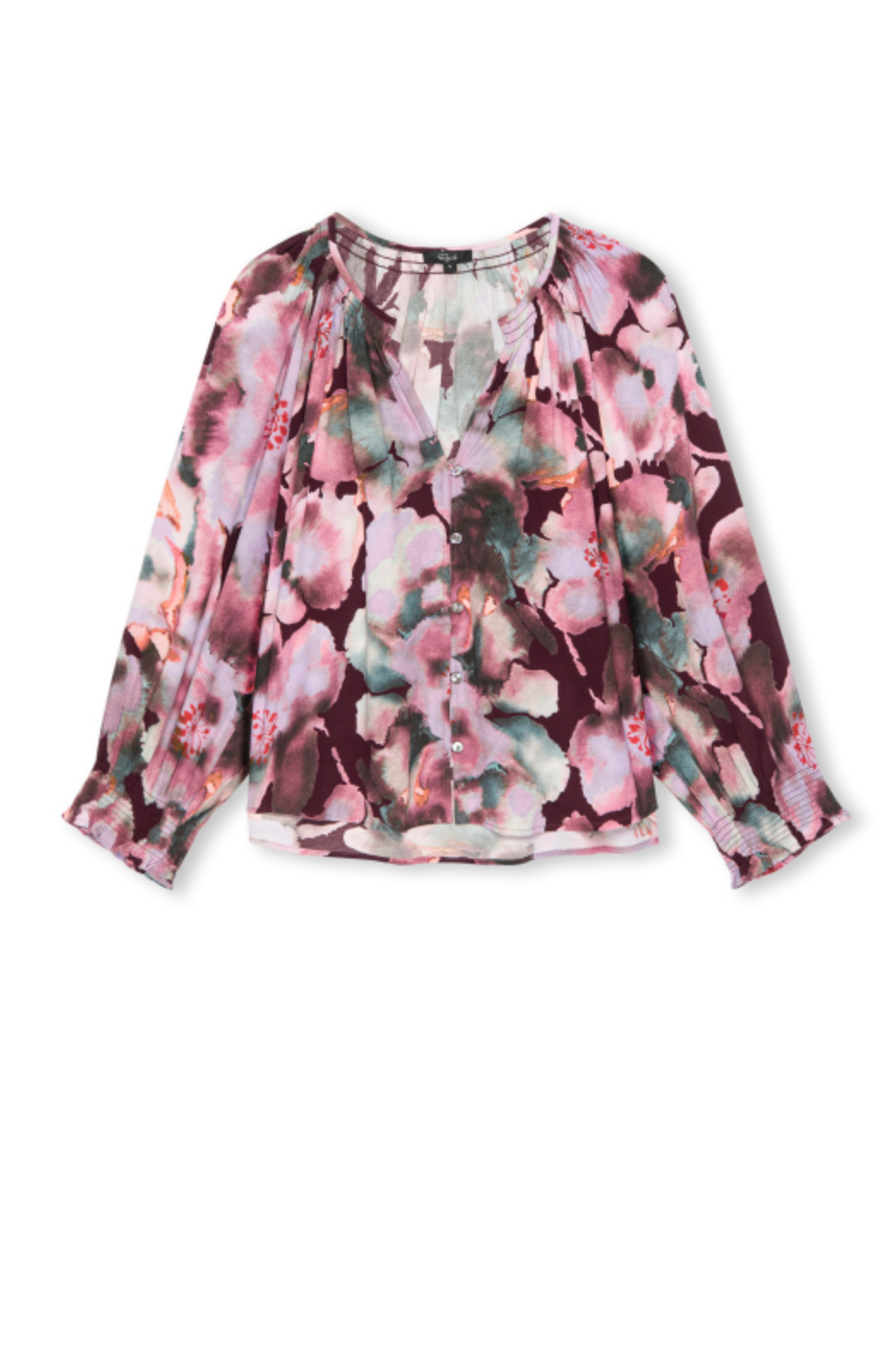 An ultra-soft rayon crepe blouse designed to keep you comfortable. The Mariah features three-quarter sleeves with shirred cuffs, a roomy fit and natural shell buttons.