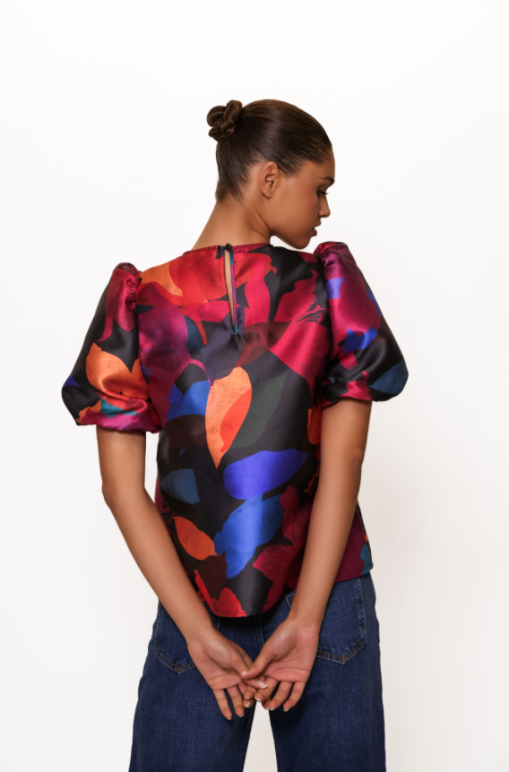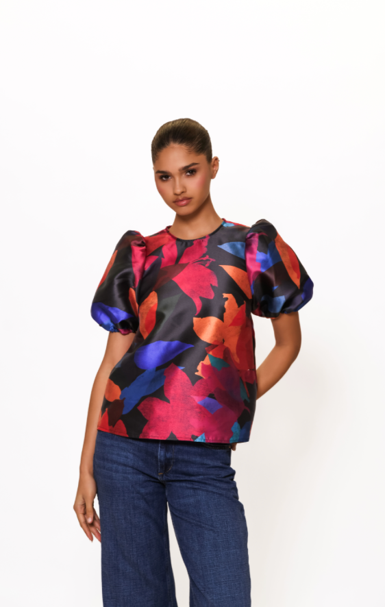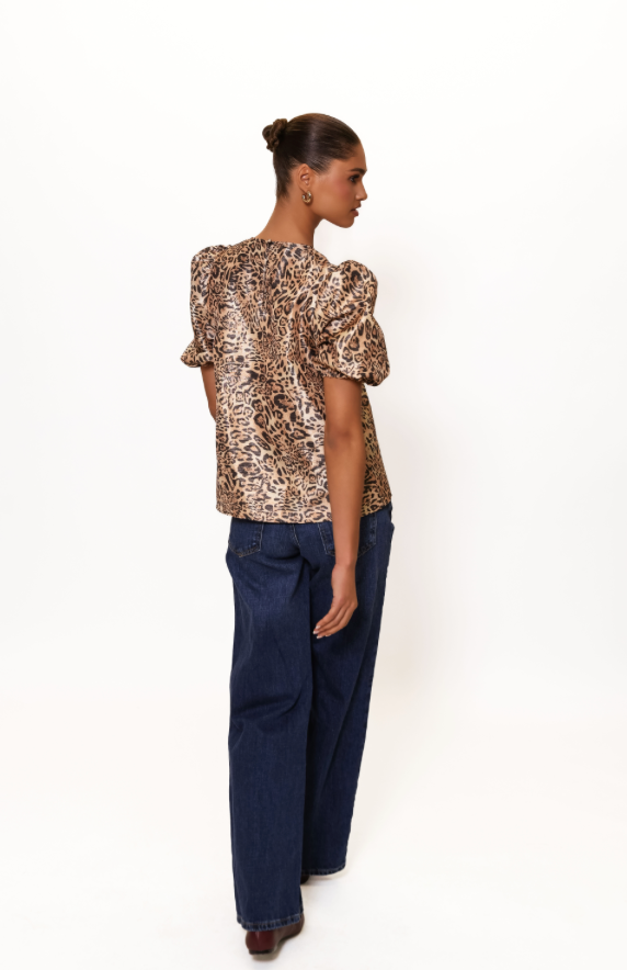 Add a playful touch to your fall wardrobe with the Nadine top, featuring charming puff sleeves and a breezy short-sleeve design. Choose between two fun prints: wild leopard metallic or a vibrant navy multi-floral, perfect for as the seasons change.