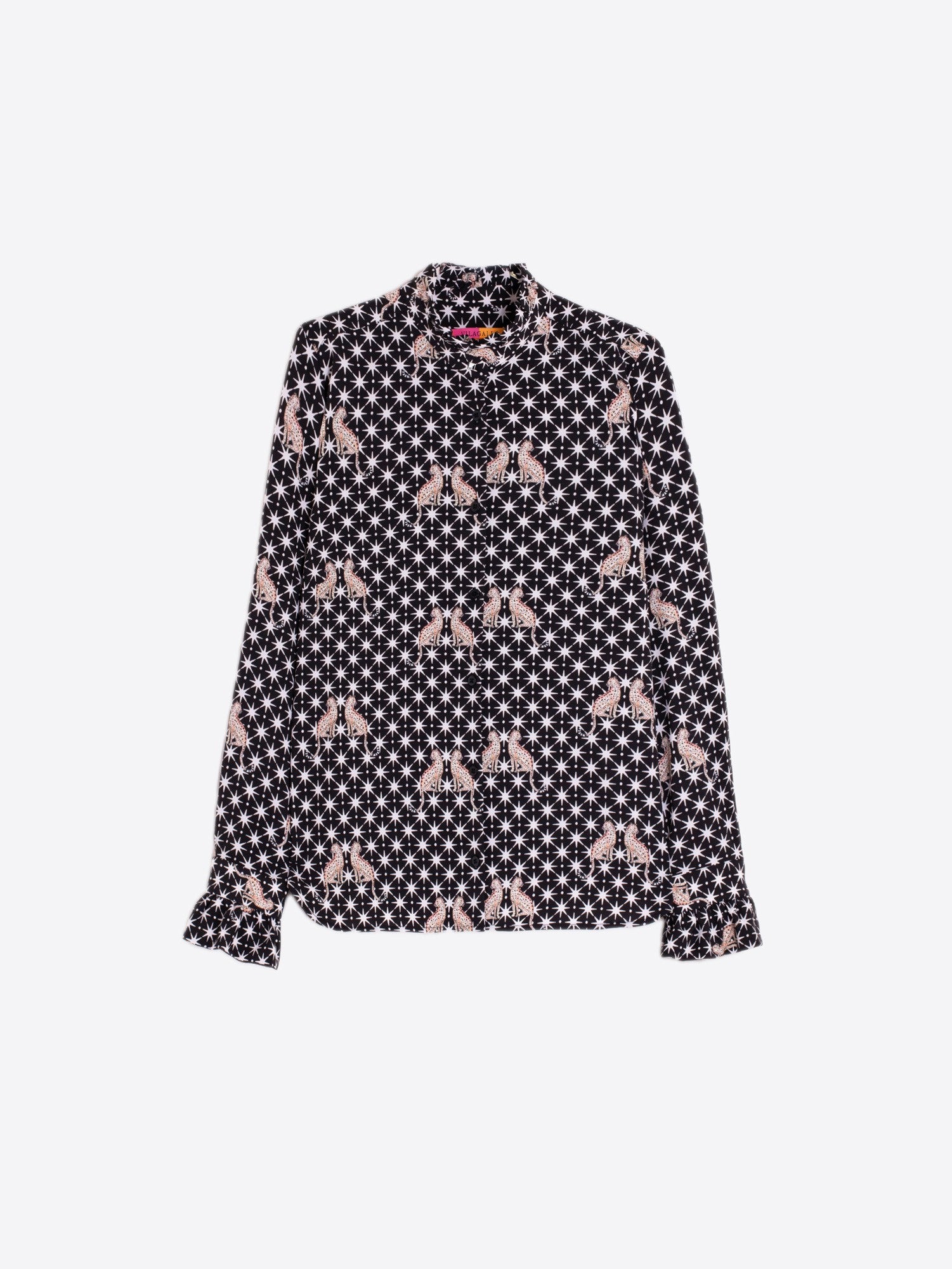Black blouse with repeated print of white stars and leopards. High collar with subtle ruffle. Front button closure. Long sleeves finished with frilled cuffs. Straight fit. Lightweight, fluid fabric.