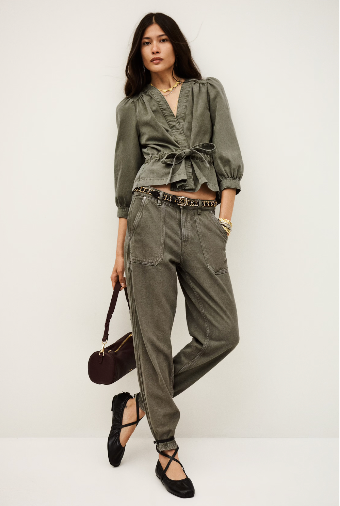 The Olavina top brings a playful twist to your wardrobe with its soft denim fabric made from organically farmed cotton. Featuring a flattering V-neckline and gathered 3/4 sleeves, it combines comfort with style. The wrap design and drawstring belt let you customize your fit, making it perfect for any casual outing or relaxed day.