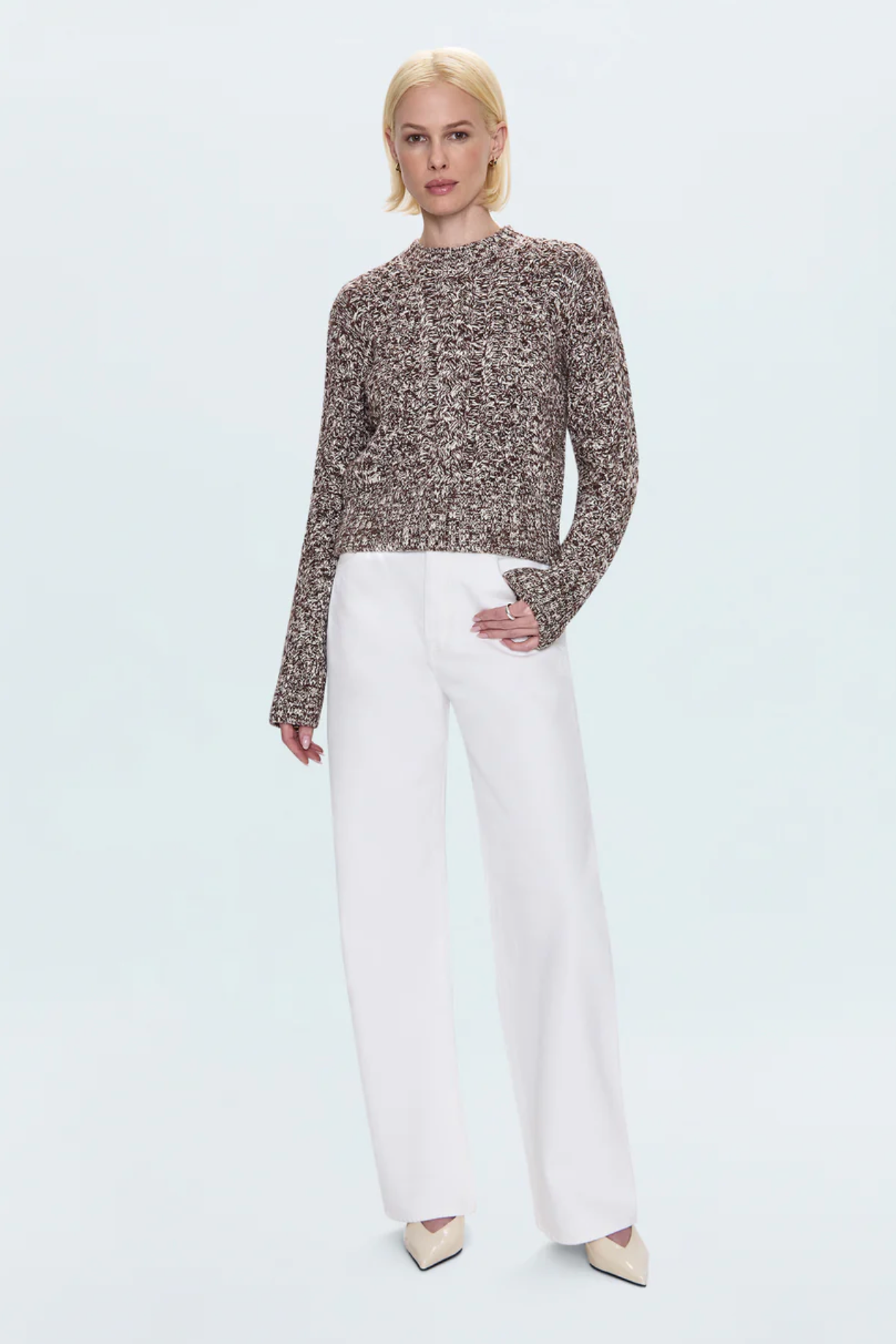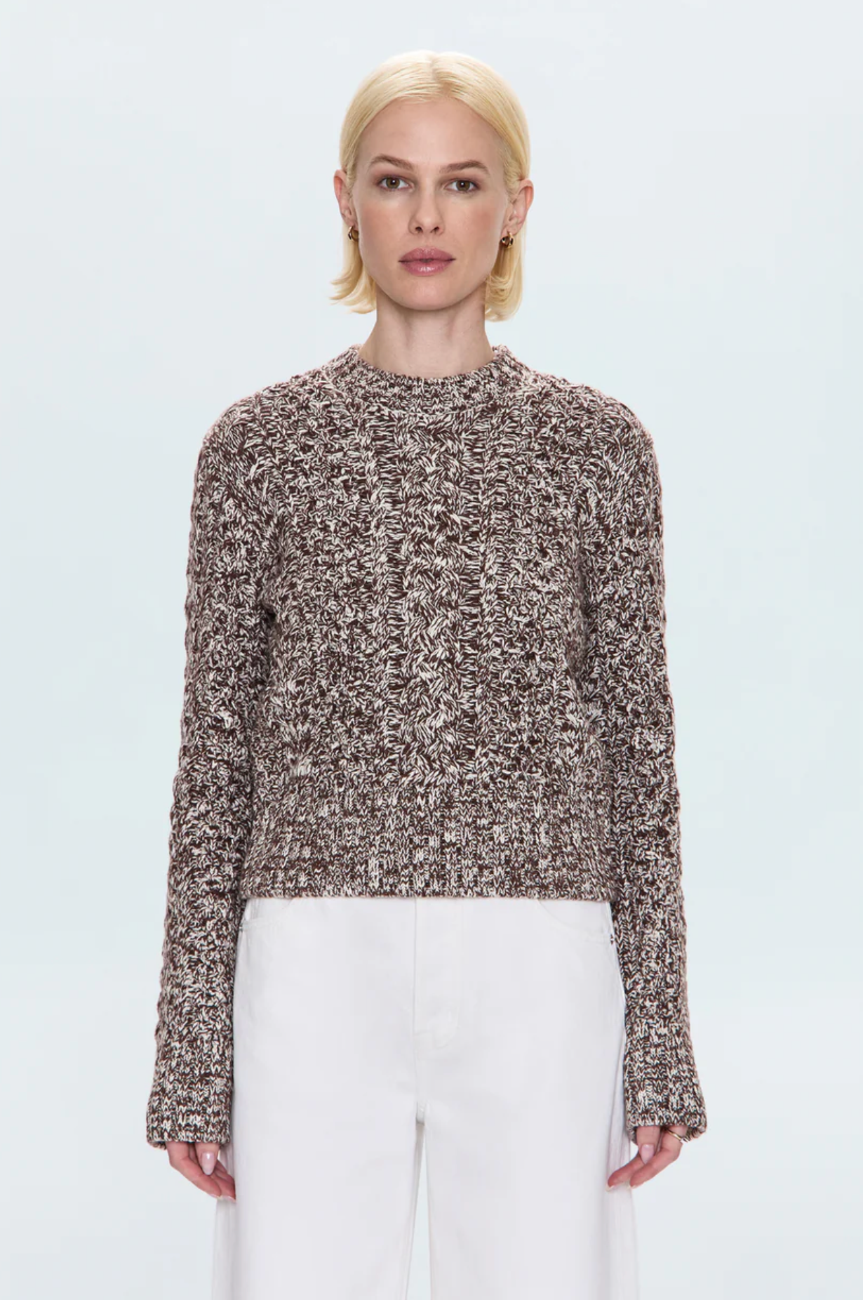 The fisherman sweater, refined for modern life. Quinn delivers classic cable knit charm with a shrunken silhouette that feels contemporary, never bulky. Our bestselling fisherman sweater brings traditional texture with modern proportions that flatter without overwhelming. Crafted from a luxurious blend of 55% cotton, 23% nylon, 17% PBT, and 5% wool that feels substantial yet comfortable for all-day wear. Chocolate Marl brings rich sophistication with its marled brown tone that adds depth and dimension.