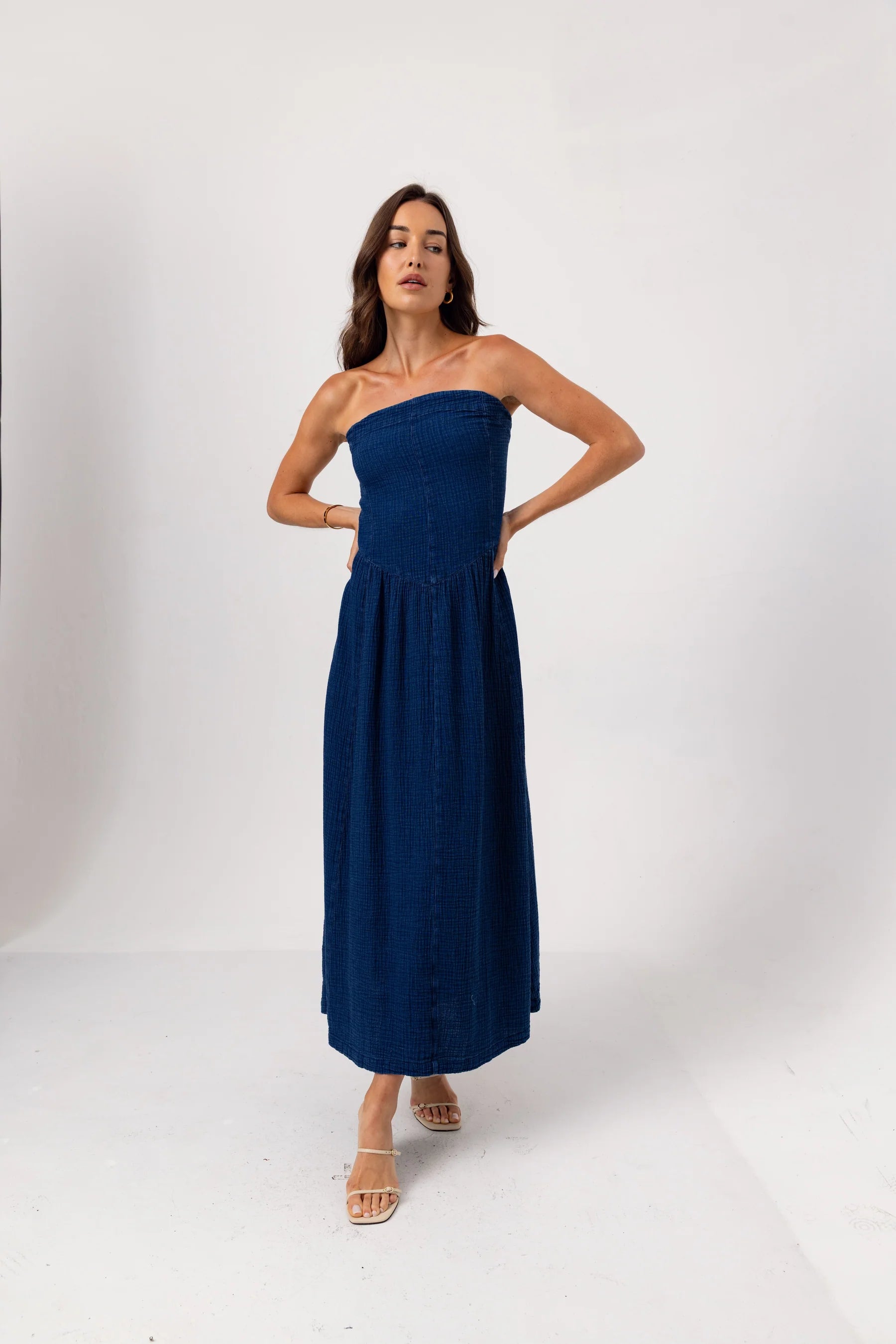 The Runa Dress is a striking strapless silhouette that highlights the depth and texture of our newly developed indigo gauze.