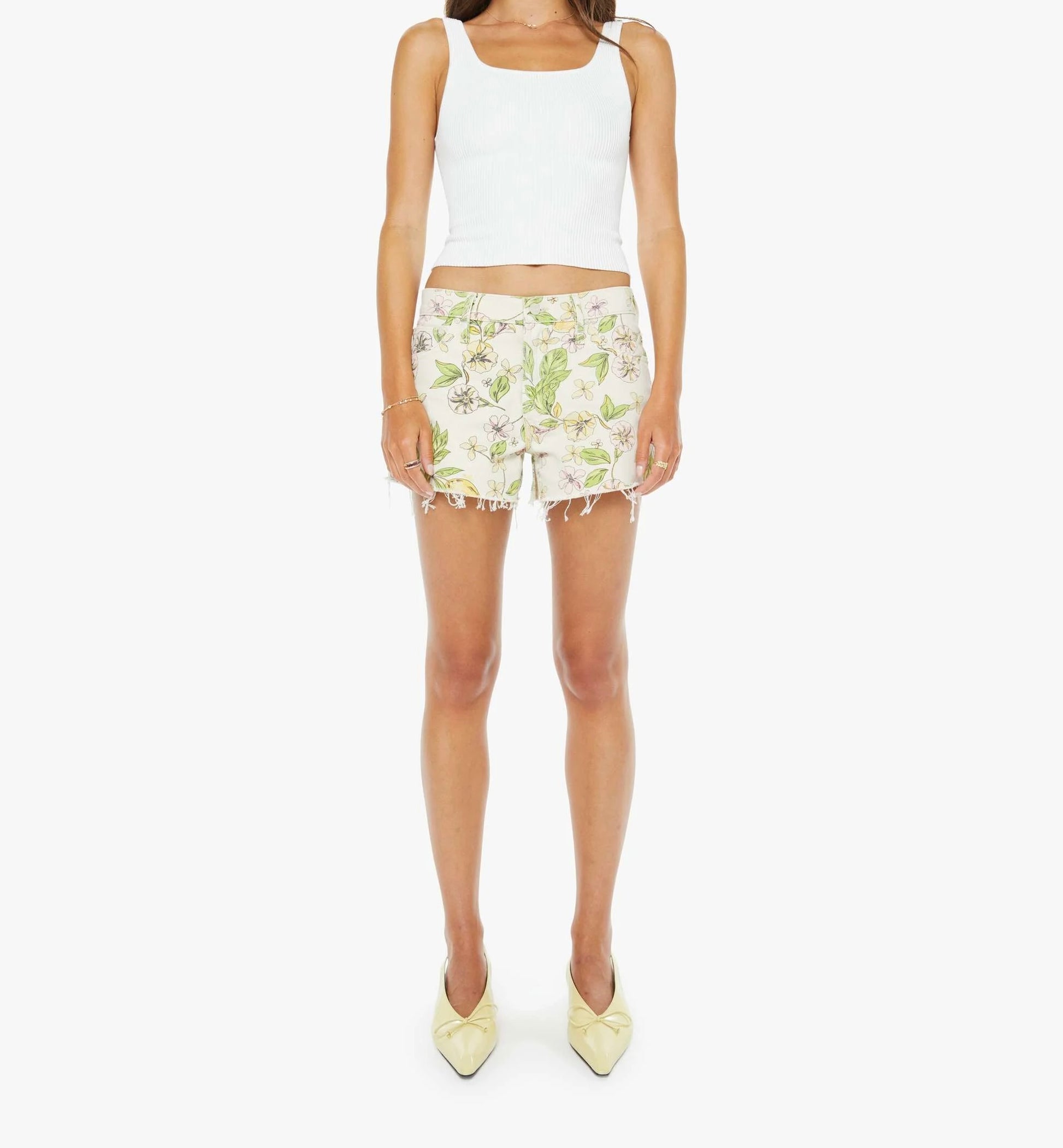 Fresh squeezed. These denim shorts are designed to sit lower on the hips with a loose leg, zip fly and 3.5-inch inseam with a frayed hem. Made from rigid SUPERIOR denim, Lemonade Stand is an off white with a pastel lemon blossom print.