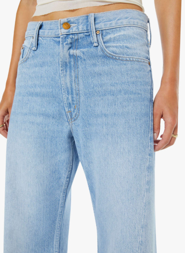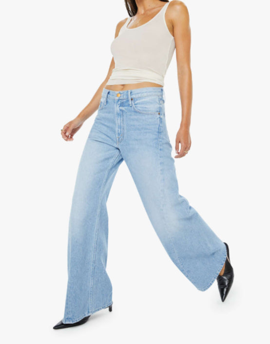 Wide leg jeans from SNACKS!, a collection of unconstrained silhouettes leaning into exaggerated shapes and extreme proportions. Experimental and non-era specific. For everyone, or not. Designed to sit on the hips with a slouchy fit, these super high-waisted jeans have a loose wide leg with a curved outer seam and a long 32-inch inseam with a clean hem. Made from a rigid recycled cotton blend, Munchies is a light wash-blue with a pretzel-detailed button and candy-inspired interior rivets. Would you like a treat?