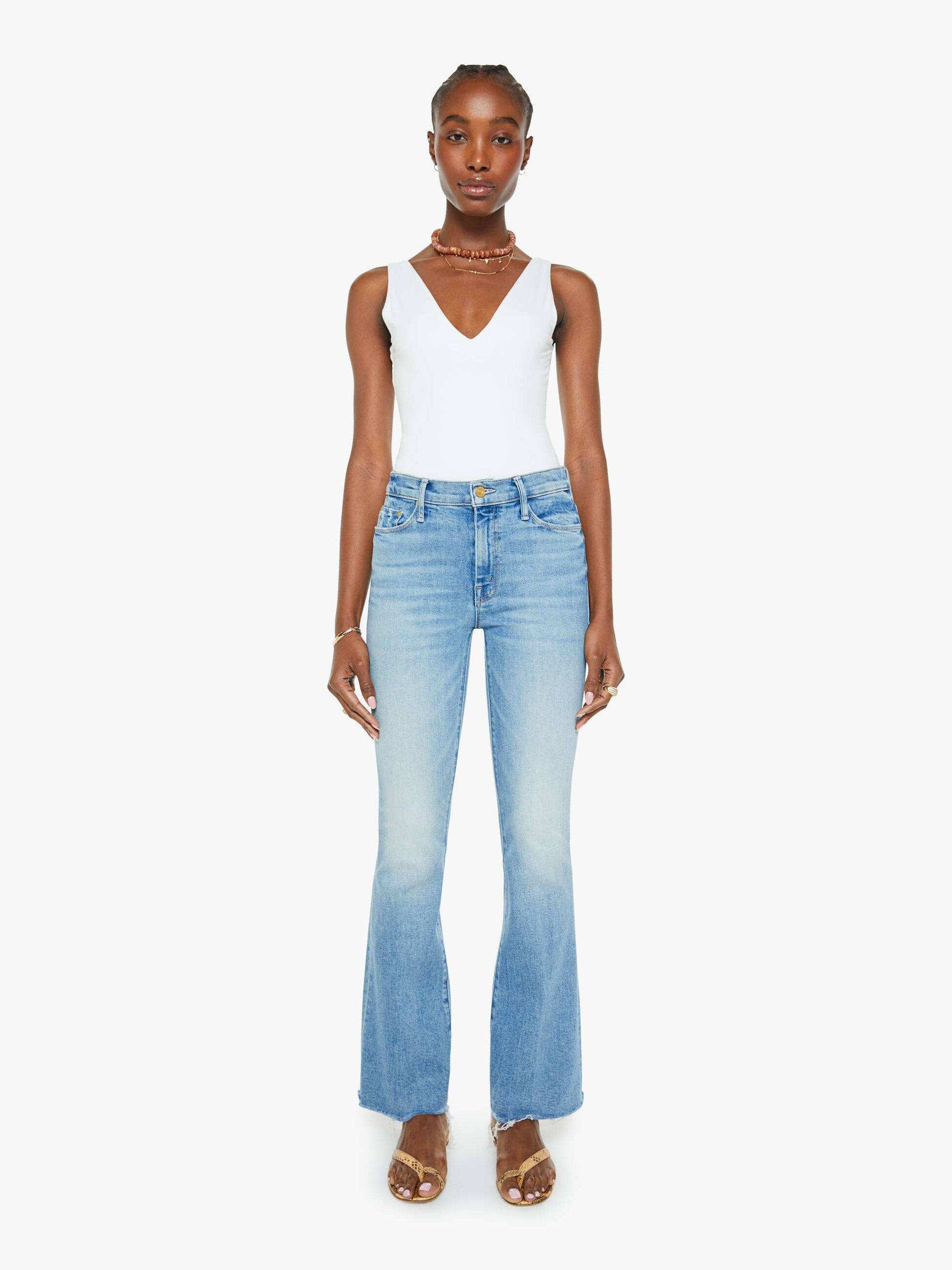 Sunkissed. Our most popular mid-rise flare has a 31-inch inseam with a frayed hem. Cut from stretch denim, Glow Up is a light blue with whiskering and fading.