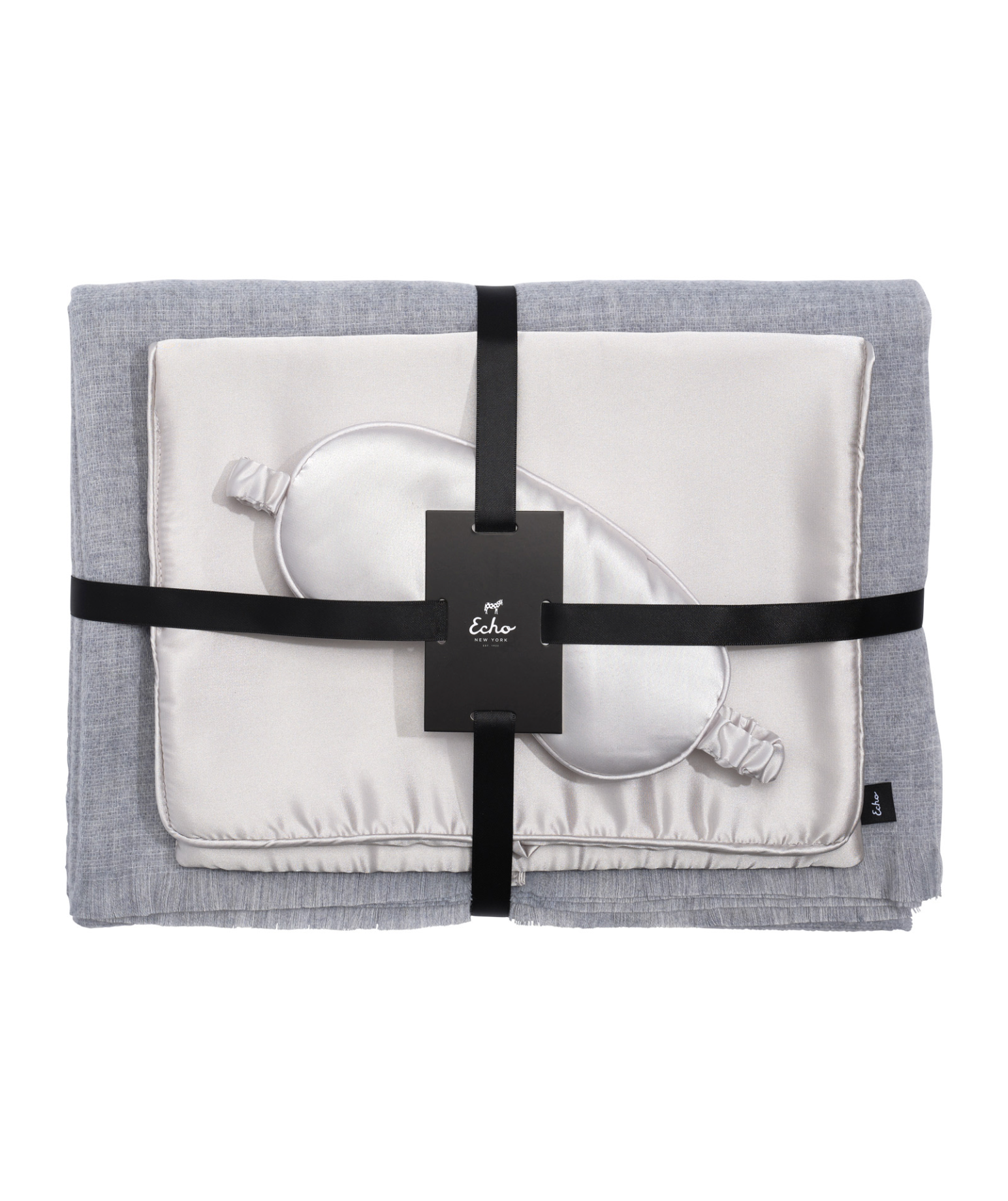 "Travel in style with our Travel Wrap Set! Made from 54% recycled polyester, 20% acrylic, 20% nylon, and 6% other materials, this set includes a luxurious scarf and eye mask, both made from 100% polyester satin. Perfect for jet-setters or as a thoughtful holiday gift."