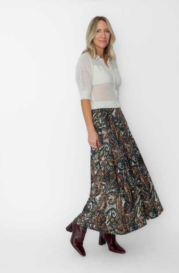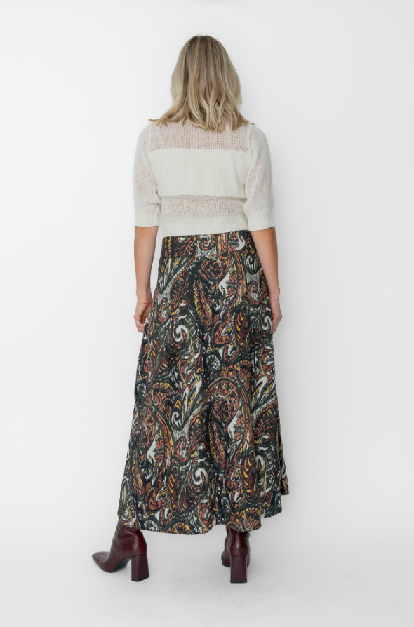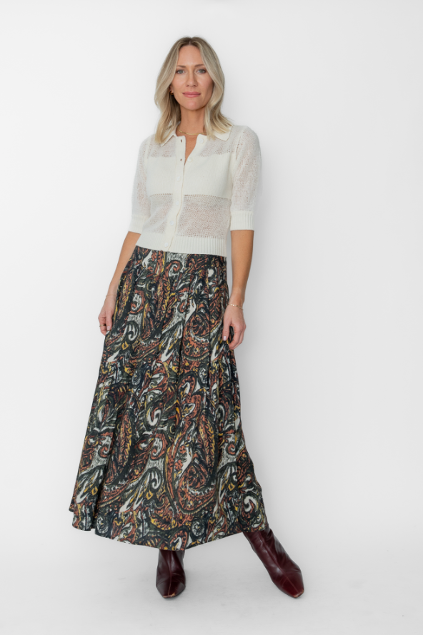 Step into fall with the Veronique Ankle Skirt, boasting a lively ikat paisley print that dances with every step. This ankle-length beauty combines cozy season vibes with a playful twist, making it perfect for crisp autumn days and effortless style that turns heads.