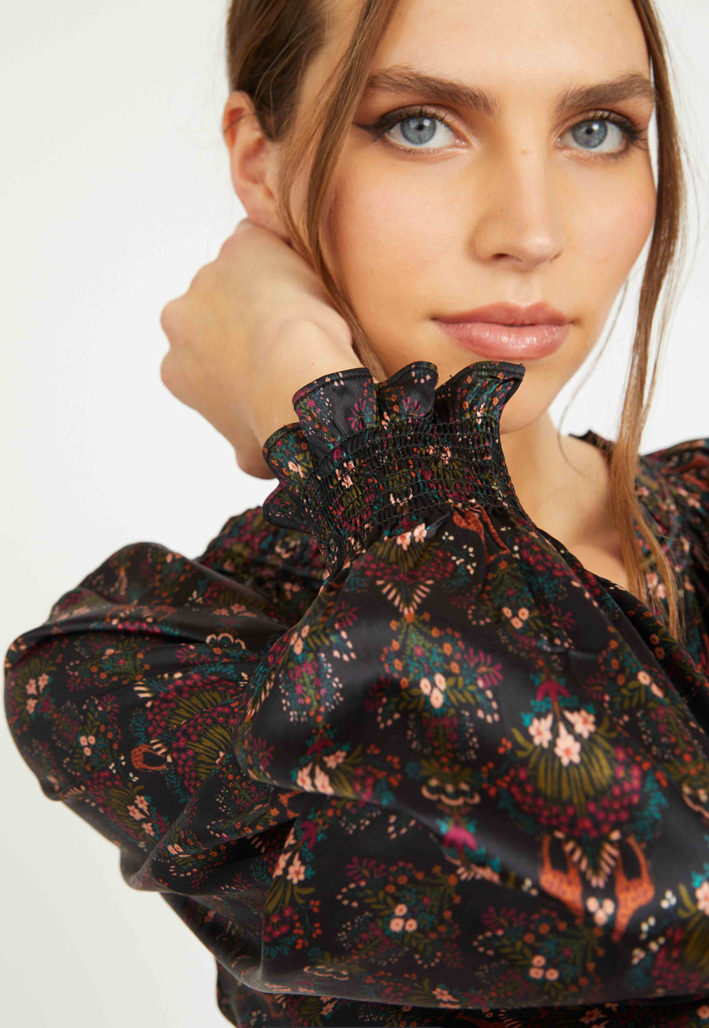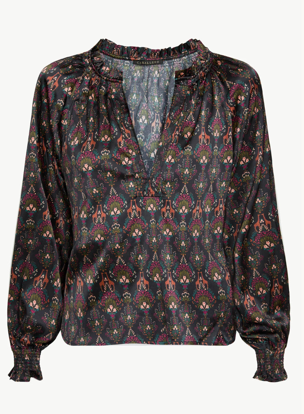 The Vickie Top in Giraffe Bouquet is crafted from a silky viscose blend for a lightweight, elegant drape. This flowy blouse features a split neckline, gathered shoulders, and long sleeves finished with smocked cuffs. The intricate Giraffe Bouquet print adds a sophisticated touch, making it perfect to pair with denim or tailored pants for an effortlessly polished look.
